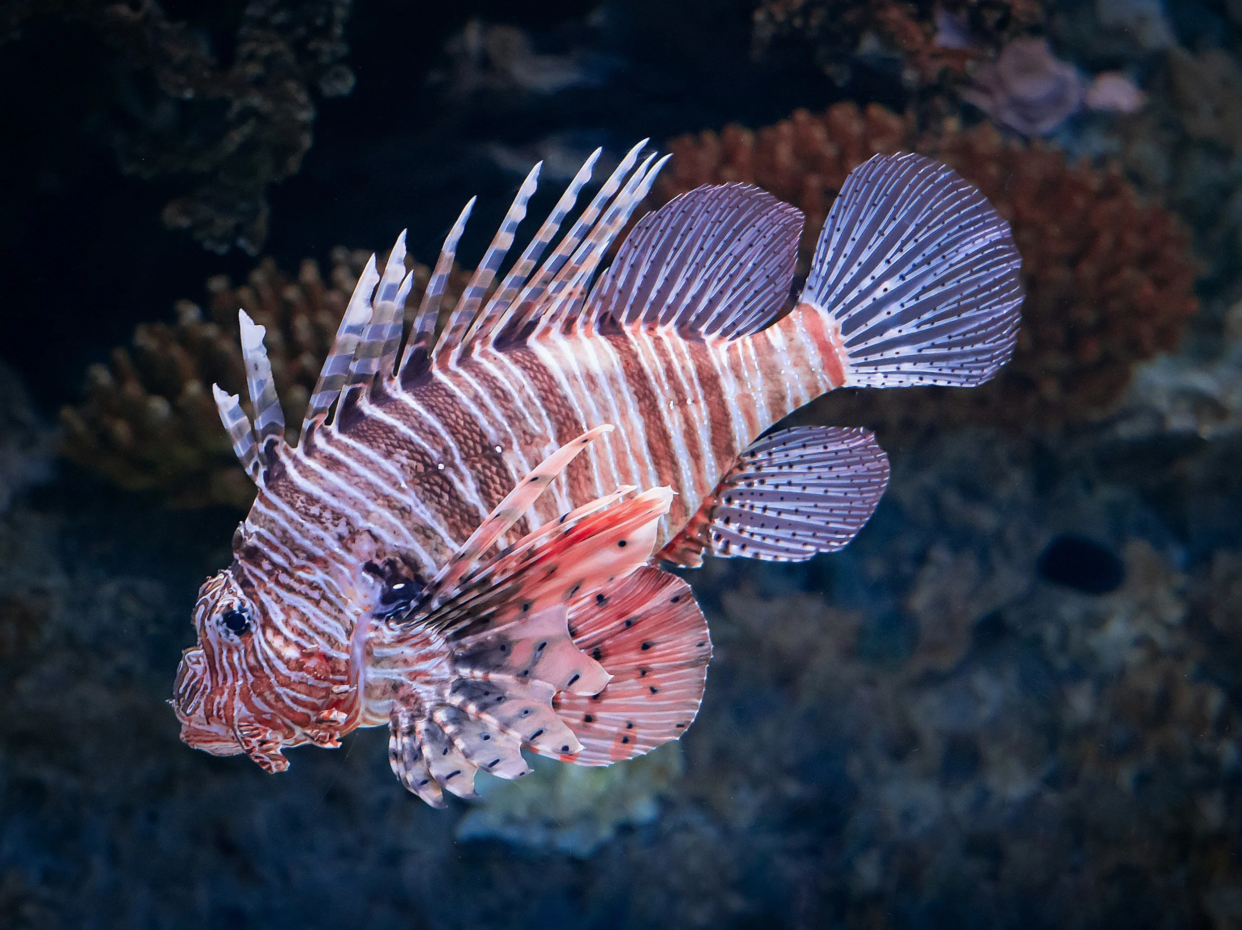 The lionfish is one of the most visually striking and dangerous fish in the ocean. With red-and-black bands reminiscent of a tiger and long, venomous spines for protection, it is often considered one of the most beautiful fish in the world. Over the past forty years, however, lionfish have become the most well-known invasive fish species in the Americas. Lionfish pose a severe threat to native fish populations and the overall health of coral reef systems. Research has shown that a single lionfish can reduce the recruitment of native reef fish by 79 percent (NOAA Fisheries). Lionfish feed on native species such as snappers and groupers, which increases stress on coral reefs.